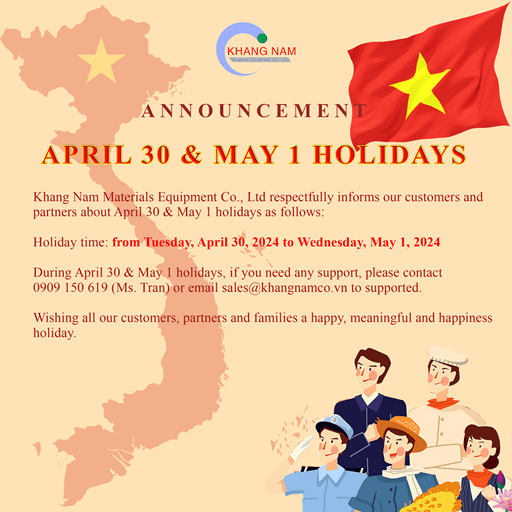 Công ty TNHH MTV Vật Tư Thiết Bị Khang Nam trân trọng thông báo đến Quý Khách hàng, Quý Đối tác về thời gian nghỉ lễ 30/4 và 1/5 như sau: