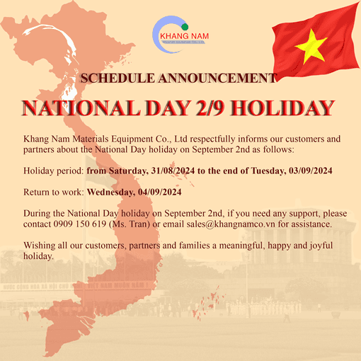 Công ty TNHH MTV Vật Tư Thiết Bị Khang Nam trân trọng thông báo đến Quý Khách hàng, Quý Đối tác về thời gian nghỉ lễ Quốc Khánh 2/9 như sau: