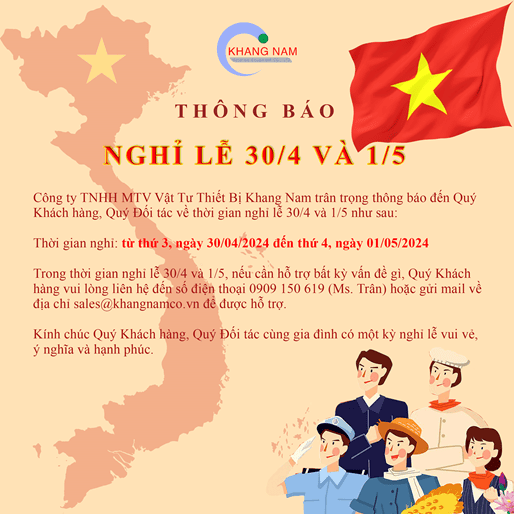 Công ty TNHH MTV Vật Tư Thiết Bị Khang Nam trân trọng thông báo đến Quý Khách hàng, Quý Đối tác về thời gian nghỉ lễ 30/4 và 1/5 như sau: